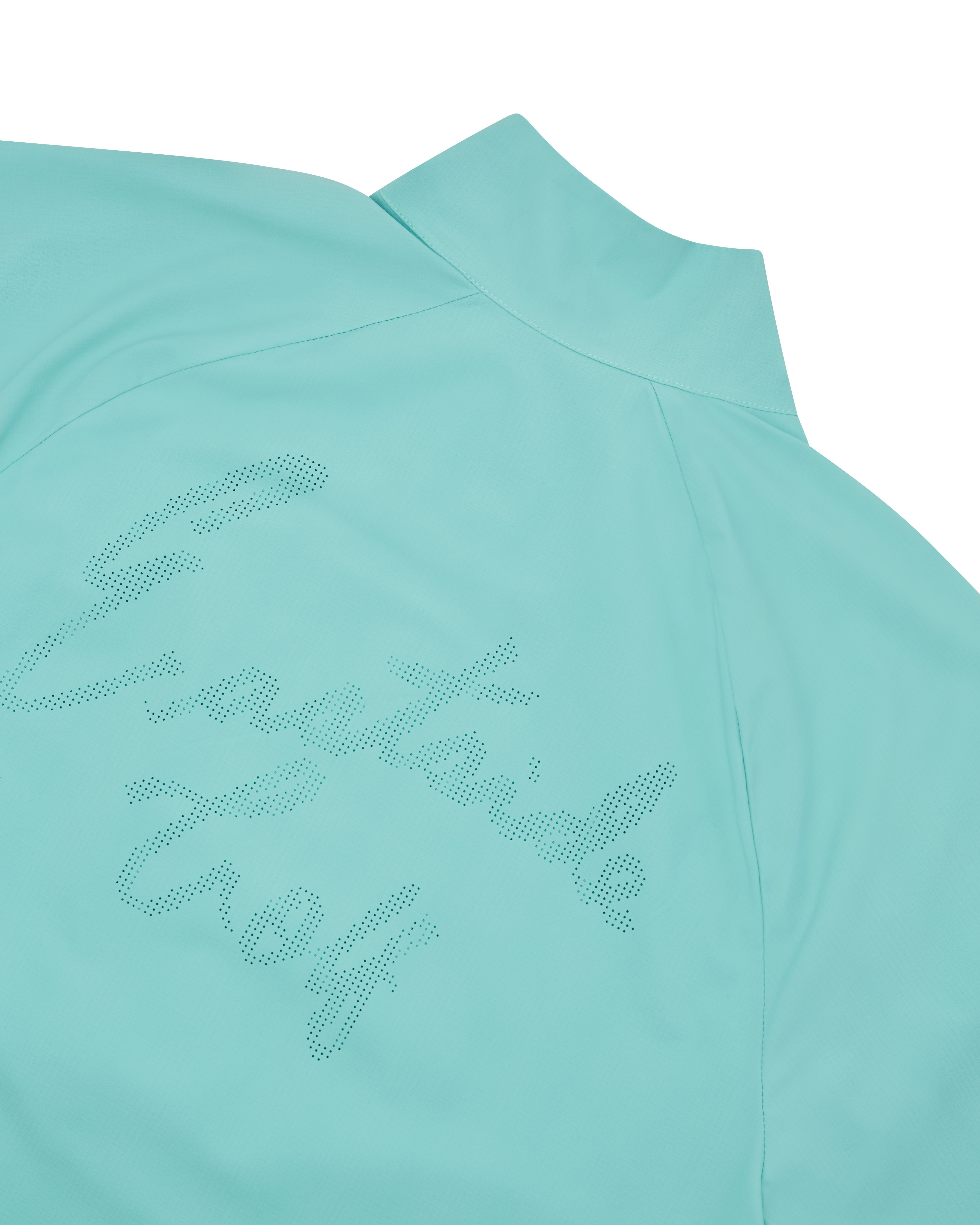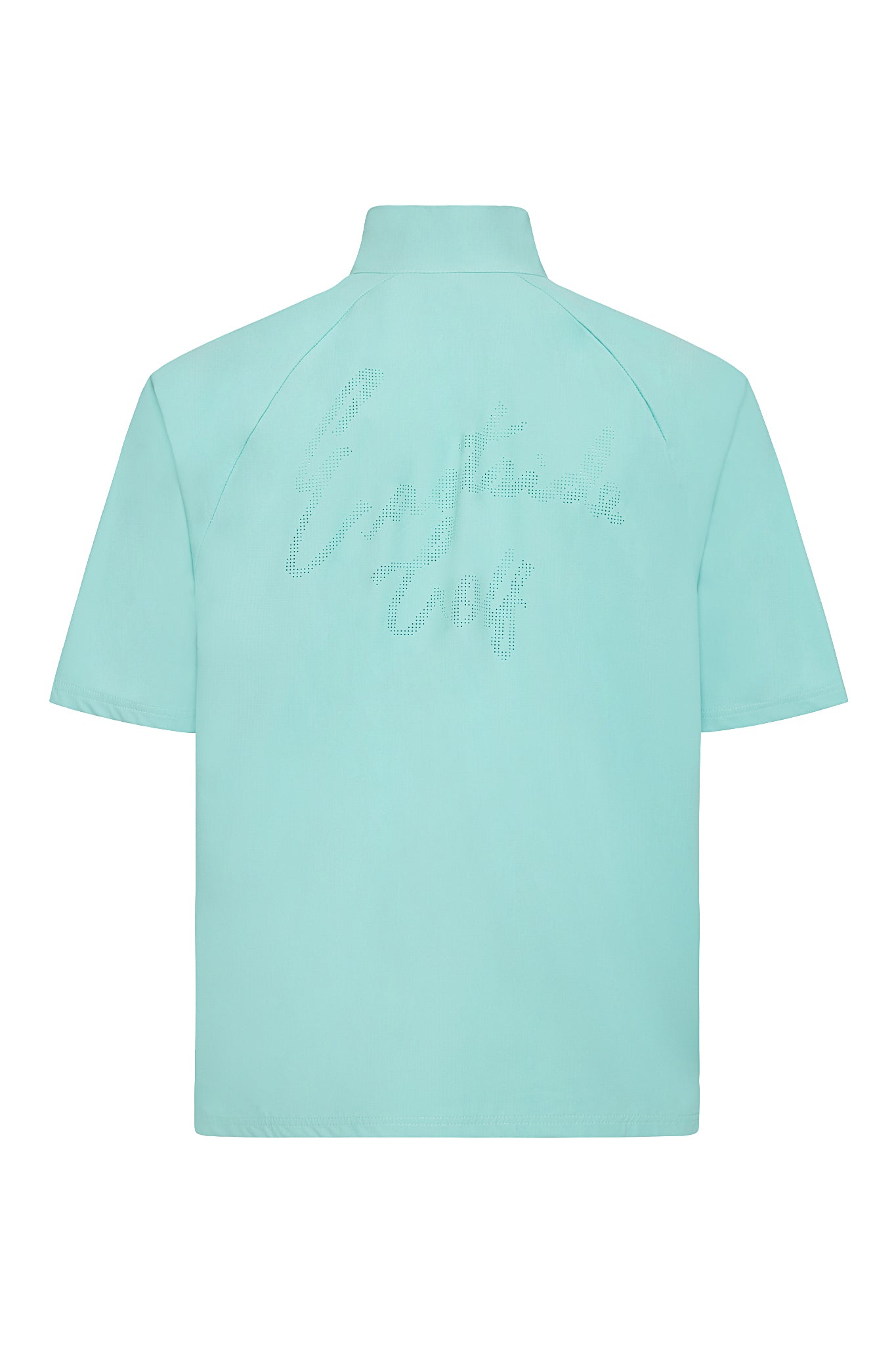 Minimalist design with a bold perforated script logo on the chest.